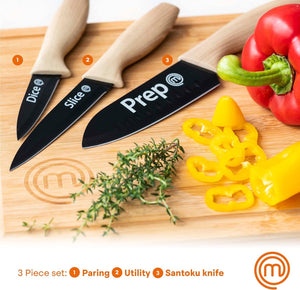 - OFFICIAL MASTERCHEF PRODUCT - This professional quality 3 piece wood look knife set is an official product of MasterChef the TV Series, designed in Great Britain.