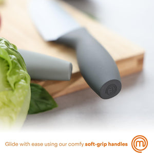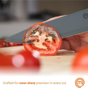 The MasterChef knives are coated in a protective non-stick covering to prevent scratching and damage during storage/transit. Fitted with hand sharpened, stainless steel blades, our knives are designed to glide through a number of tough foods with ease. From swedes to croissants, these high quality blades are perfect for tackling foods with both precision and speed.