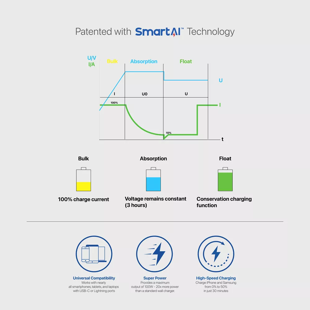 MICRODIA’s patented SmartAI technology intelligently adjusts power output for the fastest and most efficient charge. Whether powering up laptops, tablets, smartphones, or accessories, this charger delivers peak speed and reliability.