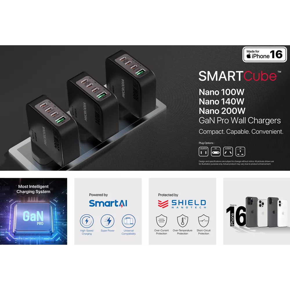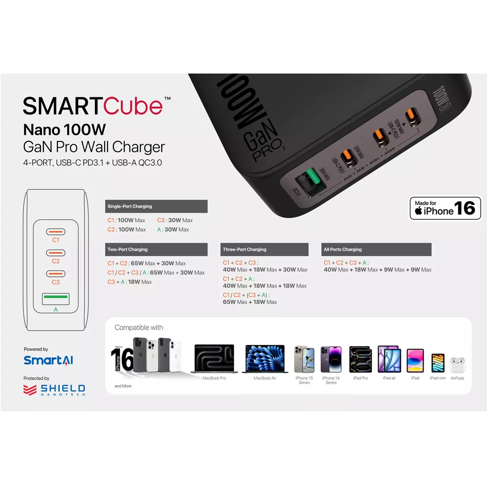 Experience the world’s smallest 100W 4-port wall charger, built for seamless multi-device charging. The SMARTCube Nano redefines portability and efficiency with cutting-edge technology in an ultra-compact form.