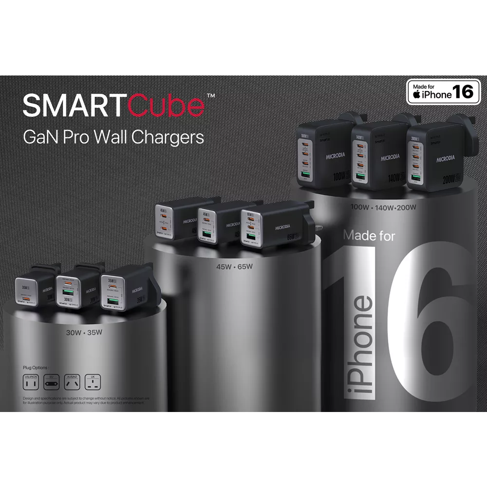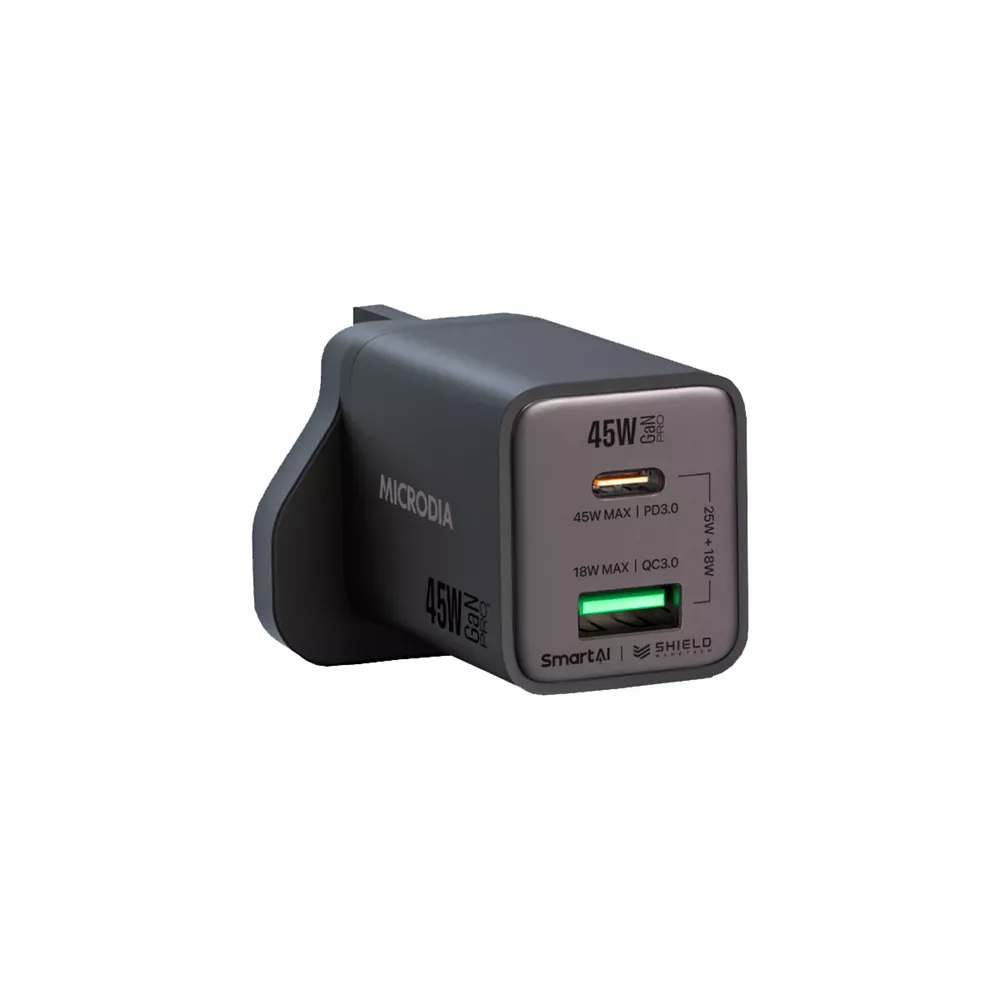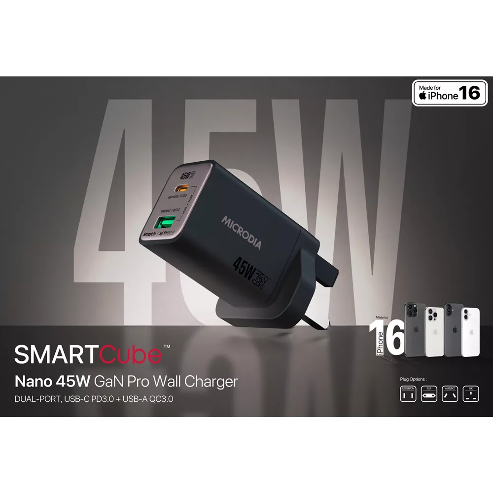 Microdia SmartCube Nano 45W USB-C & USB-A SmartAI PD Wall GaNPro Charger Plug Charcoal