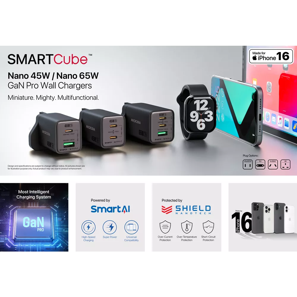 Meet the world's smallest 65W wall charger, engineered for peak efficiency and portability. The SMARTCube Nano delivers uncompromising performance with three ports, allowing simultaneous charging of multiple devices.