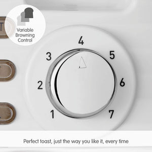 Easy to operate with variable browning control gives you perfect toast, to your taste, every time. It comes complete with handy defrost and re-heat settings, plus the removable crumb tray ensures that cleaning-up is easy.