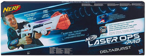 The Nerf laser ops pro deltaburst blaster gives players everything they need to face off in head-to-head live-action laser battles right out of the box. The deltaburst blaster fires a multi-shot ir burst with each pull of the trigger and registers hits with lights and sounds. An lcd screen on the back displays health status and ammo capacity. Designed with unlimited ammo, the blaster has a quick-reload button to replenish supply. Select to face off in a team or free-for-all. Adjust for the environment with the indoor-outdoor switch. Battlers can amp up their play via the Nerf laser ops app by using the included armband to wear a smartphone device (not included) on their arm. In the app, they can access real-time battle intel that allows them to customize the blaster, track their performance, earn power-ups, and locate opponents during battle. Attach included solo attachment to the blaster for single-player battling with the application, requires 6 x AA batteries (not included). Height: 25.4 cm- width: 68.58 cm, length: 6.67 cm, minimum age: 8 years, recommended age: 8 years plus, warning: Choking hazard. Not suitable for children under 3 years of age due to small parts. Not for use in complete darkness.