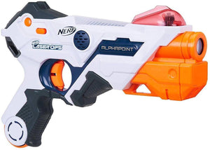 The Nerf laser ops pro alphapoint blaster gives players everything they need to face off in head-to-head live-action laser battles right out of the box. The blaster fires a single-shot IR burst with each pull of the trigger and registers hits with lights and sounds, while lights on the back display health status and ammo capacity. Designed with unlimited ammo, the blaster has a quick-reload button to replenish supply. Select to face off in a team or free-for-all. Adjust for the environment with the indoor-outdoor switch. Battlers can amp up their play via the free laser ops app by using the included armband to wear a smartphone device (not included) on their arm. In the app, they can access real-time battle intel that allows them to customize the blaster, track their performance, earn power-ups, and locate opponents during battle. Attach the included solo attachment to the blaster for single-player battling with the application. Requires 4 x AA batteries (not included).