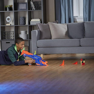 Blast into motorised, rapid-fire stunt challenges with the Nerf Nitro MotoFury Rapid Rally set. Power up the blaster’s motor with the acceleration button, take aim, and unleash the cars into fast-firing action. The blaster has a clip that holds up to 9 cars, so load up the clip and send the cars flying out of the blaster and into speed-driven, high-flying stunts! The MotoFury Rapid Rally set comes with 6 cars and 3 cars that are special to this set! Nerf and all related properties are trademarks of Hasbro.