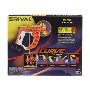 - SELECT YOUR CURVE: Select your curve mid-battle to fire around objects to give you the ultimate strategic competitive advantage with the Nerf Rival Curve Shot Flex XXI-100 blaster