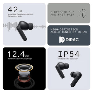 With 42 dB and a bandwidth of up 2900 Hz, CMF Buds block out the unwanted noise. The external HD microphone detects ambient noise, then the internal processor generates inverse sound waves that are emitted through the speakers to mute it. Also supports Transparency Mode.