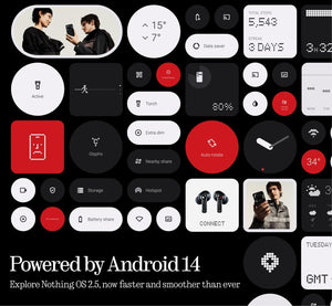 - NOTHING OS 2.5 - Powered by Android 14, it delivers the best of Android with a fast and smooth experience rooted in utility and functional customisation. Nothing Widgets: Little windows into your apps that let you do more directly from your home and lock screen. With Nothing OS 2.5, we’ve expanded our library with even more Nothing-designed widgets, with swipeable views and animations for more levels of information and interactions.