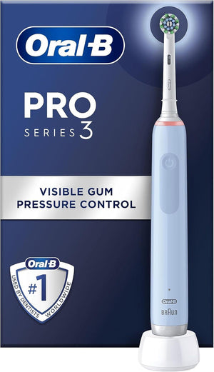 Experience Oral-B Pro Series 3 from the #1 brand used by dentists worldwide. The Series 3 electric toothbrush helps you brush like your dentist recommends: It helps you brush for 2 minutes with the professional timer and it notifies you every 30 seconds to change the area your are brushing. While you are just moving the brush around your mouth, Oral-B's unique round head does all the rest. It removes up to 100% more plaque than a standard manual toothbrush for healthier gums and it starts making your smile whiter as of the first day of brushing by removing surface stains. Not only this, but the toothbrush helps you protect your delicate gums with the 360 ̊gum pressure control technology that reduces brushing speed and alerts you to be gentler if you brush too hard. Oral-B Pro Series 3 is the must have brush for everyone who wants to switch to an electric toothbrush and improve their oral health.