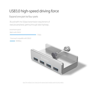 ORICO MH4PU Aluminum Alloy 4 Ports USB 3.0 Clip-type HUB with 1m USB Cable, Clip Width Range: 10-32mm