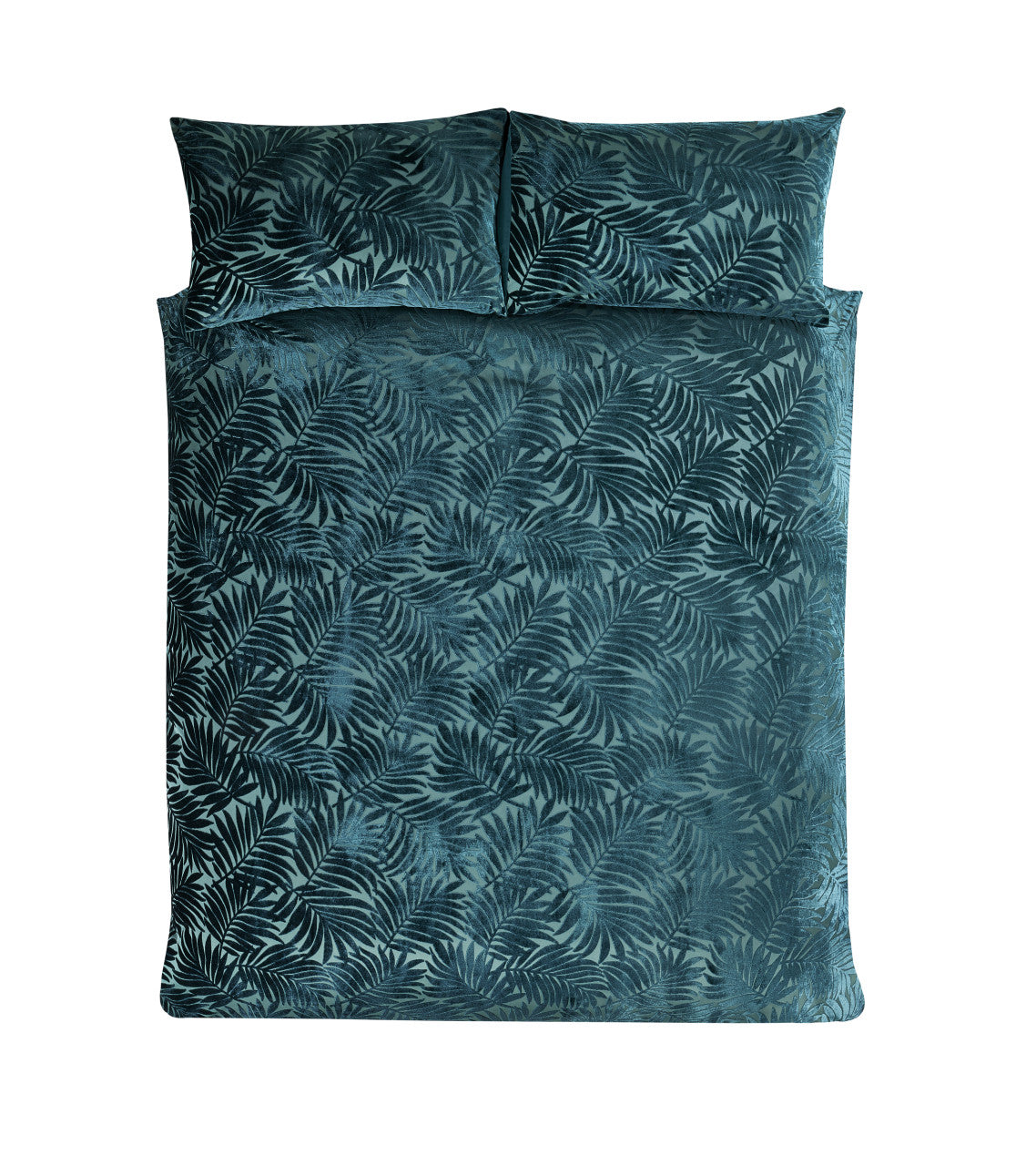 Paloma features an all over palm leaf plush velvet jacquard in a rich shade of emerald green or navy blue. This will add a touch of tropical luxury to your bedroom. With a plain polycotton reverse, it ensures a relaxing nights sleep while adding that wow factor to your bedroom.