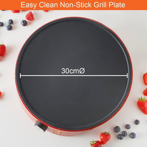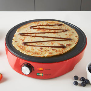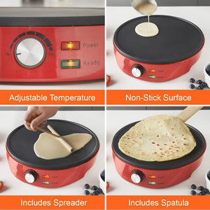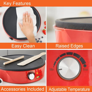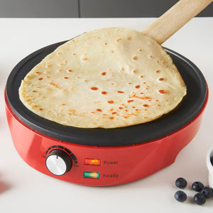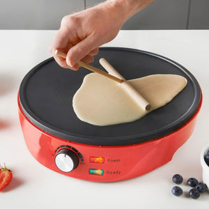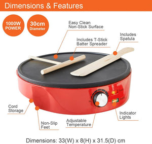 Pancake and Crepe Maker /Non-Stick Hot Plate with Raised Edges for Reduced Wastage /Adjustable Temperature /Wooden Spreader & Spatula Included /1000W
