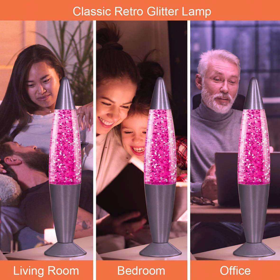 - GLITTERY LAVA LAMP – This fantastic modern twist on a traditional lava lamp will provide a nostalgic & retro look and feel to your home, kids’ bedroom or office spaces.