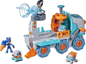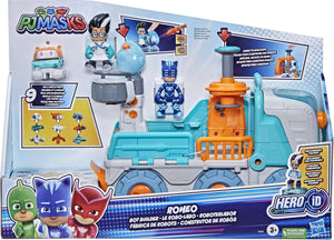 - 2-IN-1 FUN: The PJ Masks Romeo Bot Builder toy is an awesome vehicle and a robot factory in one super cool toy! Kids will love the fun accessories, 2 PJ Masks action figures, and lights and sounds