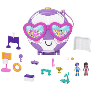 - The Polly Pocket Soccer Squad compact has a soccer ball design featuring cute sunglasses on the exterior filled with shakable glitter and comes with micro Bella and friend dolls.