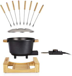 The Princess Fondue Pure Black is a modern and stylish 1.5L fondue built with bamboo housing and a cast iron nonstick dish which is suitable to dine up to eight people. There are eight stainless steel and bamboo forks included as well as a fondue ring for easy use. Heats to a maximum 1900C with easy temperature control and four heat settings.