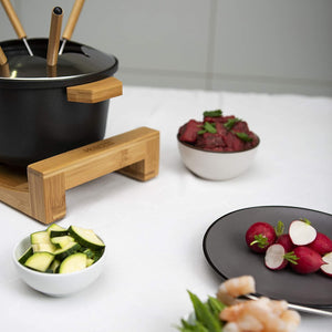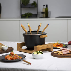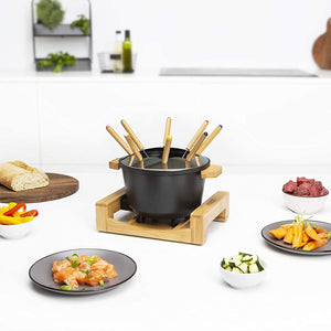 - Modern and elegant 1.5L fondue with bamboo housing and aluminium cast iron dish