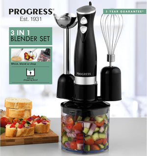 - Food preparation has never been easier thanks to the Progress 3 in 1 Blender Set, designed with 3 functions: chop, blend, and whisk!