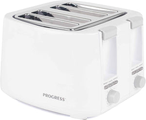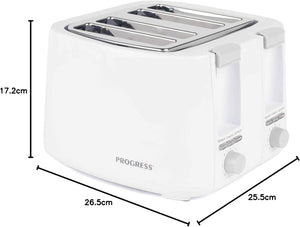 Progress 4 Slice Toaster – Anti-Jam Auto-Centring Toasting Slots, Adjustable 7 Levels of Browning, Compact Design, Defrost/Reheat/Cancel Functions, Removable Crumb Tray, 1500 W, White
