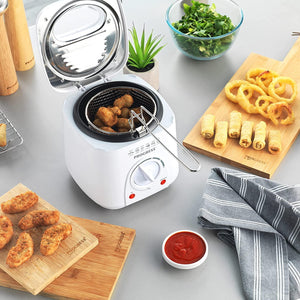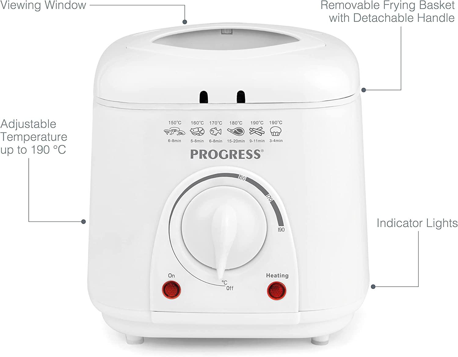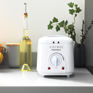 Progress Compact Mini Deep Fat Fryer - Removable Easy Clean Cooking Basket, Small 1L Deep Fryer, 950W, Non-Stick Chip Pan, Detachable Handle, Variable Temperature To 190°, 20.7 x 19.2 x 19cm