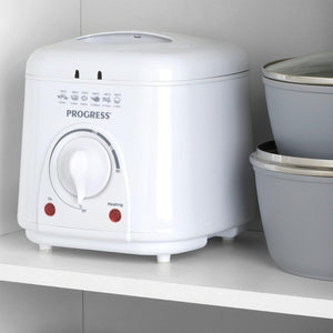 Indulge in homemade chips, fried chicken, calamari and more with this compact and portable deep fat fryer from Progress, which features a 1 L capacity that makes it ideal for single-serving portions. The 950 W unit is equipped with a non-stick cooking bowl and adjustable temperature dial, as well as power on and ready indicator lights for added ease of use. With a space-saving design and detachable basket handle, it will fit comfortably on the kitchen counter and is easy to store away after use.