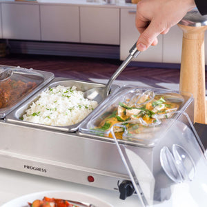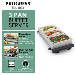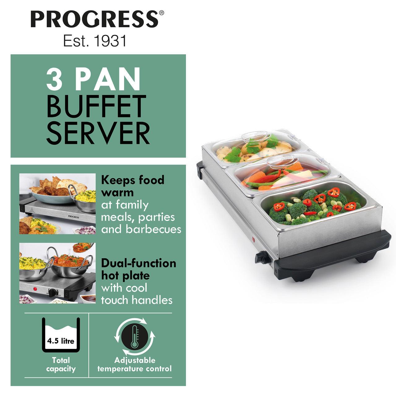 - Great for family meals, dinner parties and catering, the 4.5 L Progress Three Pan Buffet Server keeps food warm for up to three hours.