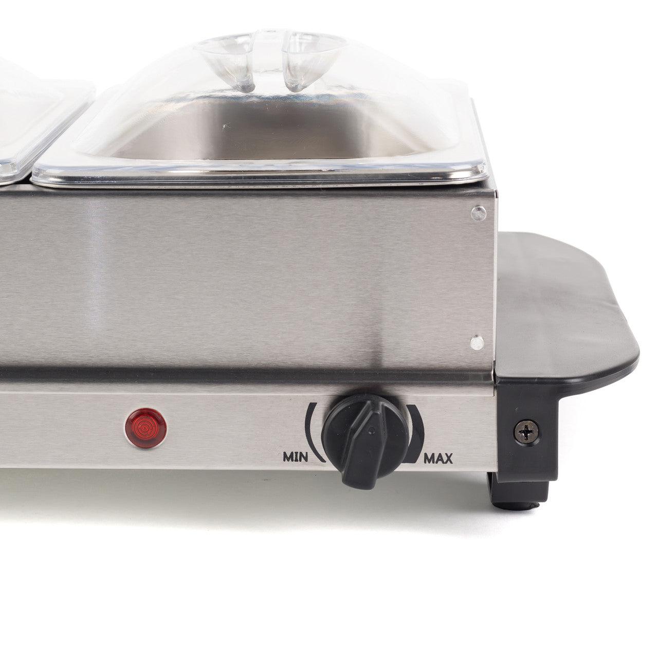 Keep food warmer for longer at family meals, parties and events with the Progress Three Pan Buffet Server. This dual-function chafing dish tray also acts as a hot plate, simply remove the serving dishes and pan frame. Portable and lightweight, this 200 W serving tray holds up to 4.5 litres across the three stainless steel pans with lids. Cool-touch handles complete the hot plate, with adjustable temperature controls in order to keep food warm for up to three hours at the table or during service.