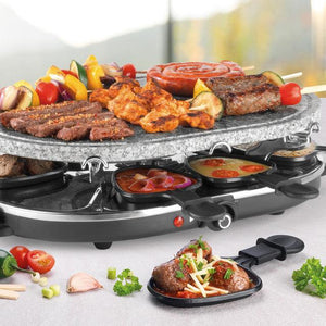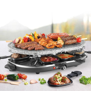 - Featuring eight grill pans and spatulas, and a removable stone plate, this grill provides everything you need for an impressive dinner.