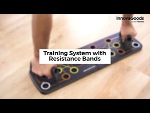 A comprehensive workout system with removable exercise board, grips, resistance bands and exercise guide. Ideal for exercising the entire body. The board highlights exercises for 4 muscle groups: chest, shoulders, back and triceps, the chest exercise being the most widely recognised. The rubber bands can be used for the arm exercises (mainly biceps) and for legs (mainly glutes). The intensity of the exercise can be controlled by adjusting the size of the elastic bands with the help of the metal hooks on the base.