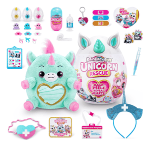• Package Inclusions 1x Unicorn Rescue Plush, 1 x Unicorn Egg, 1x Reveal 'n' Heal Heart, 3x Boo-Boocorns Eggs, 3x Dr Boo-Boocorns, 1x Headband, 1x Magic Healing Wand, 1x Magical Slime, 1x Rainbocorns Poop, 1x Get Well Soon Card, 1x Body Check Report, 2x X-ray Stickers, 3x String, 1x Pack of Beads, 3x Charms