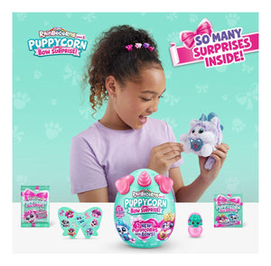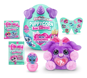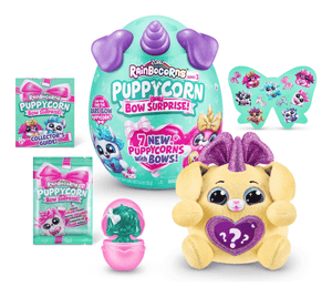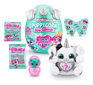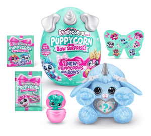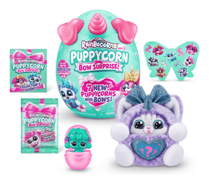 • Pack Inclusion: 1 x Puppycorn Egg, 1 x Puppycorn Plush, 1 x Peel and Reveal heart, 1 x Puppy Bow, 1 x Boo-Boocorn Egg, 1 x Boo-Boocorn Pup, 1 x Rainbocorn Jelly Slime Poop, 1 x Puppycorn Sticker Pack, 1 x Collectors Guide