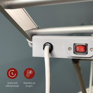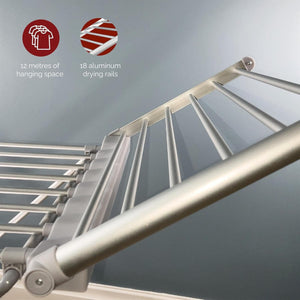 - GENEROUS CAPACITY: With its generous capacity boasting 18 aluminium heated drying rails, this airer provides a robust and durable platform for your laundry needs. Offering 12 meters of hanging space, it ensures ample room for all your garments.