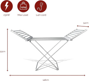 Rediffusion Winged Heated Clothes Airer, 18 Heated Rails, 12m Hanging Space,15kg Weight Capacity, Indoor Airer, Energy Efficient, 148 x 93 x 54 cm, Silver