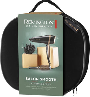 Elevate your hair game with the Remington Salon Smooth Hair Dryer Gift Set, featuring a variety of tools for achieving salon-quality styles at home. This 2100W dryer boasts a 100km/h airflow, making drying and styling speedy and efficient. From straightening with the concentrator to enhancing curls with the diffuser, this set has all your hair needs covered. Complete with a round brush, stylish storage bag, this set makes a perfect gift for a loved one or the perfect treat for yourself.