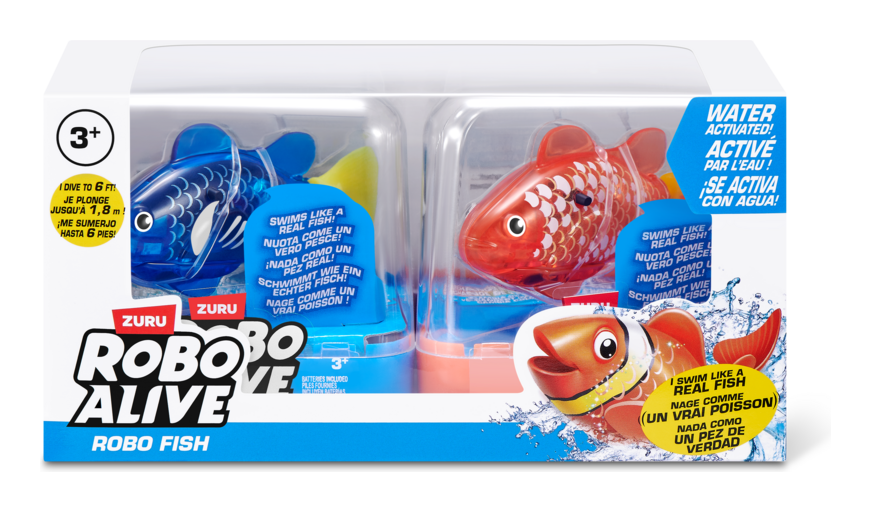 • ZURU Robo Fish: Drop your Robo Fish in water and watch it come to life with ZURU’s advanced water activated technology! These fish swim in 5 different directions and dive up to 6ft!