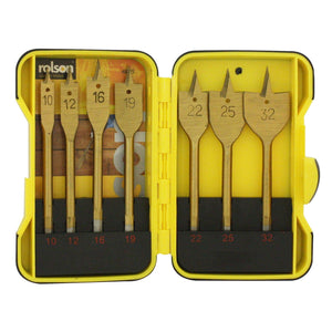 A 7-piece set of flat drill bits, ideal for drilling large holes in wood.