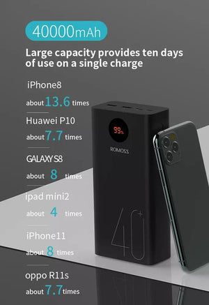 - Enough power for a week - Get a reliable power source with the ROMOSS PEA40 40,000mAh High-Capacity Power Bank Travel Battery Pack. Stay connected and charged up wherever you go