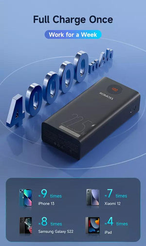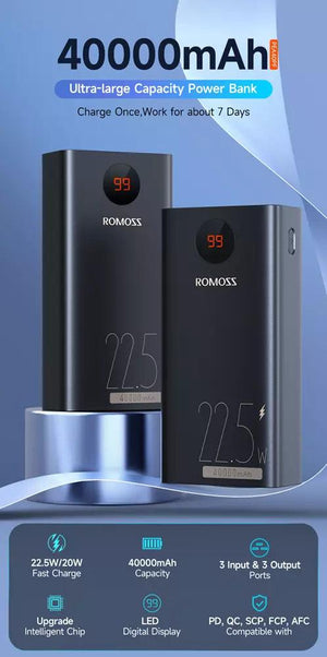 - High Capacity - Get up to 40,000mAh of power with the ROMOSS PEA40PF portable battery pack. Experience fast charging with its 2-way PD 22.5W with Type C and 2 Type-A ports and stay powered for longer. Portable charger for iPhones, iPads, and more