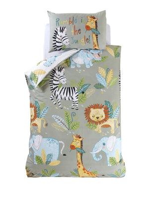 Welcome to a wild adventure with our 'Rumble in the Jungle' Children's Duvet Set. It features vibrant, images of zoo favorites - giraffes, zebras, and elephants, creatively rendered in shades of light brown and green. This fully reversible design, is packed with hidden details, offering a fun and interactive bedtime experience. The light silver and brown tones fuse seamlessly with highly detailed foliage, giving it an explosive wildlife feel. This eco-friendly, recycled fabric set includes a duvet cover and pillows that will turn your child's room into a playful jungle retreat. Embrace the call of the wild today!