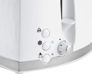 - Textured Design - The Honeycomb 2 Slice White Toaster has a Textured Design with Stainless Steel Accents, that makes a statement on any kitchen counter.
