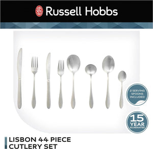 Russell Hobbs Lisbon Cutlery Set – 44 Piece Stainless Steel, Table Utensils for 12 People Dishwasher Safe, Forks/ Knives/ Spoons & 2 Serving Spoons Included in Set, 15 Year Guarantee
