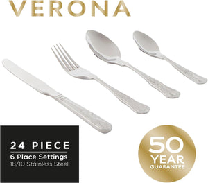 Russell Hobbs Verona Cutlery Set – 24 Piece 18/10 Stainless Steel, Table Utensils for 6 Place Settings, Dishwasher Safe, Forks/ Knives/ Spoons/Teaspoons Included in Set, 50 Year Guarantee