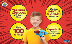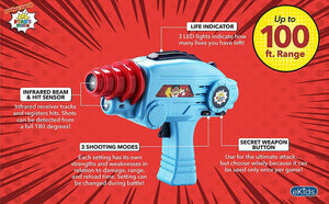 - Target sensor and long range: An infared receiver located on the front of the laser blaster tracks and registers hits (the blaster is the target). No need to wear a vest!). Shots can be detected from 180 degrees. Blasters light up and vibrate when hit.