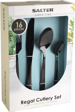 - This glossy black coated 16-piece Regal cutlery set by Salter adds unique style to your dining table and is ideal for a new homeowner.