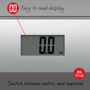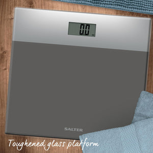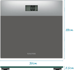 Start your fitness journey in style with the Salter Digital Bathroom Scale featuring a two tone grey and silver design. This digital scale accurately measures up to 180kg and includes a battery so you can weigh straight away! Whether you're looking to monitor your weight loss journey or maintain a healthy lifestyle, our scale has an LCD easy-to-read display and measures instantly with just a simple step-on. With a compact design, this scale can be tucked away keeping your bathroom tidy.