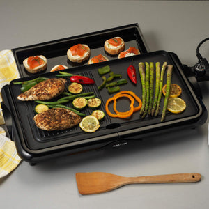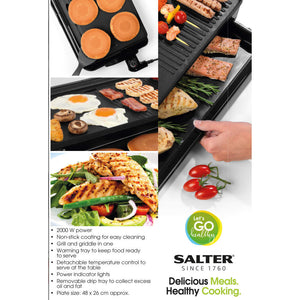 Salter Electric Health Grill - Indoor Family Grill With Warming Tray Food Server, Non-Stick Flat & Griddle Plate, Detachable Temperature Control, Removable Drip Tray, Table Top Cooking, 2000W