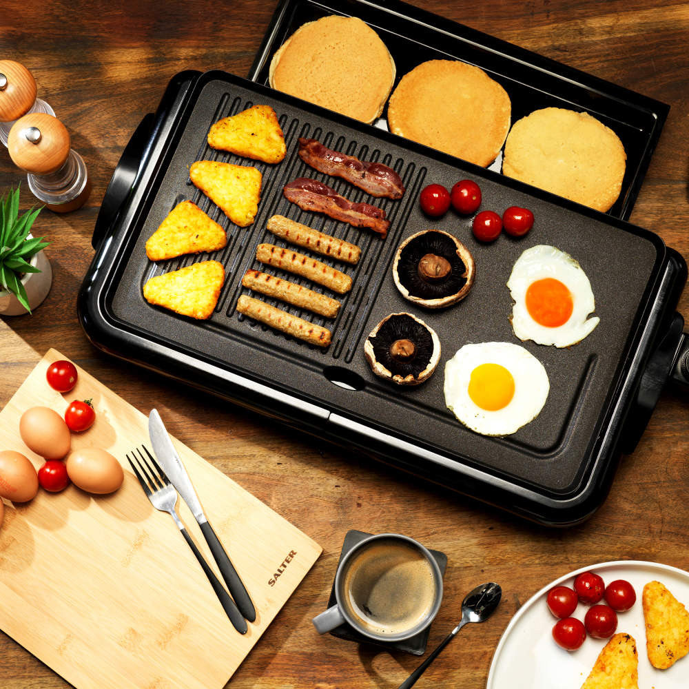 - Boasting a griddle and grill top, the Salter grill will effortlessly prepare eggs, tasty pancakes, sausages, vegetables and much more.