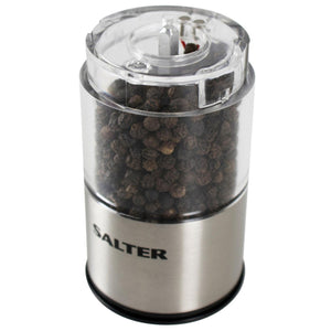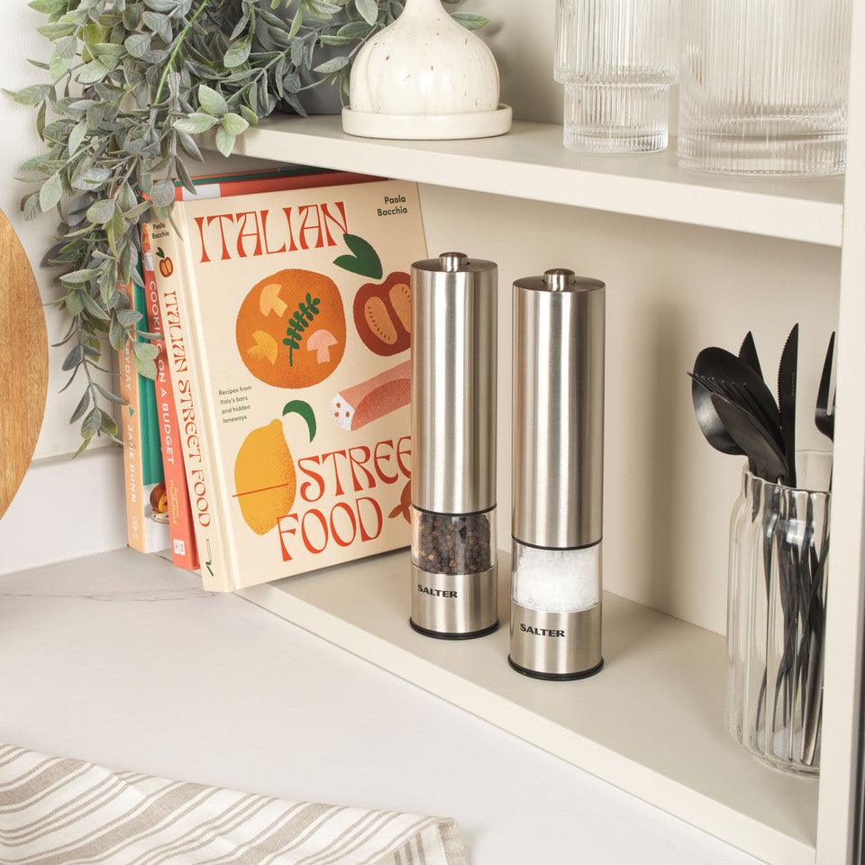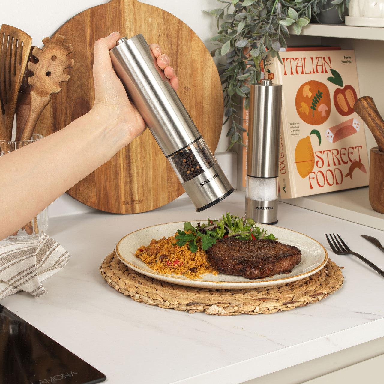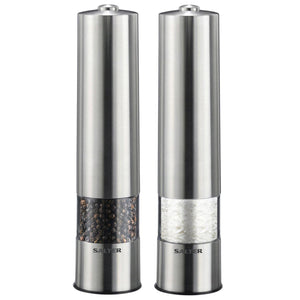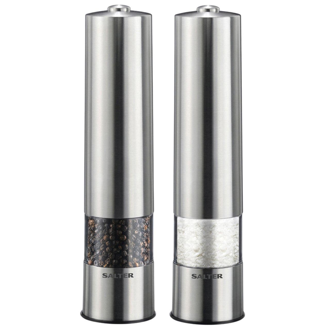 Salter Electric Salt & Pepper Mills - Stainless Steel Spice Mills, Transparent Acrylic Body, Adjustable Grind, One Touch Operation, Built in Light, Removable Base Cap, Twist Lock Base