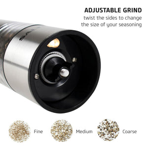 - Battery powered with an adjustable grind, simply press the button on the top of the grinder to select and dispense your seasoning.